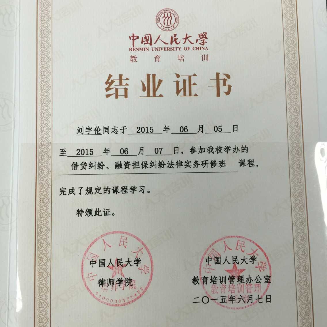 我所刘宇伦律师参加了中国人民大学于2015年6岳5日至6月7日开讲的民间融资、金融借款等融资纠纷法律事务研修班,授课老师有来自银监局的徐副处长、最高人民法院执行局赵晋山副局长、最高人民法院民二庭张雪楳审判长、原最高人民法院民二庭审判长、现金杜所律师雷继平等四位业界专家。