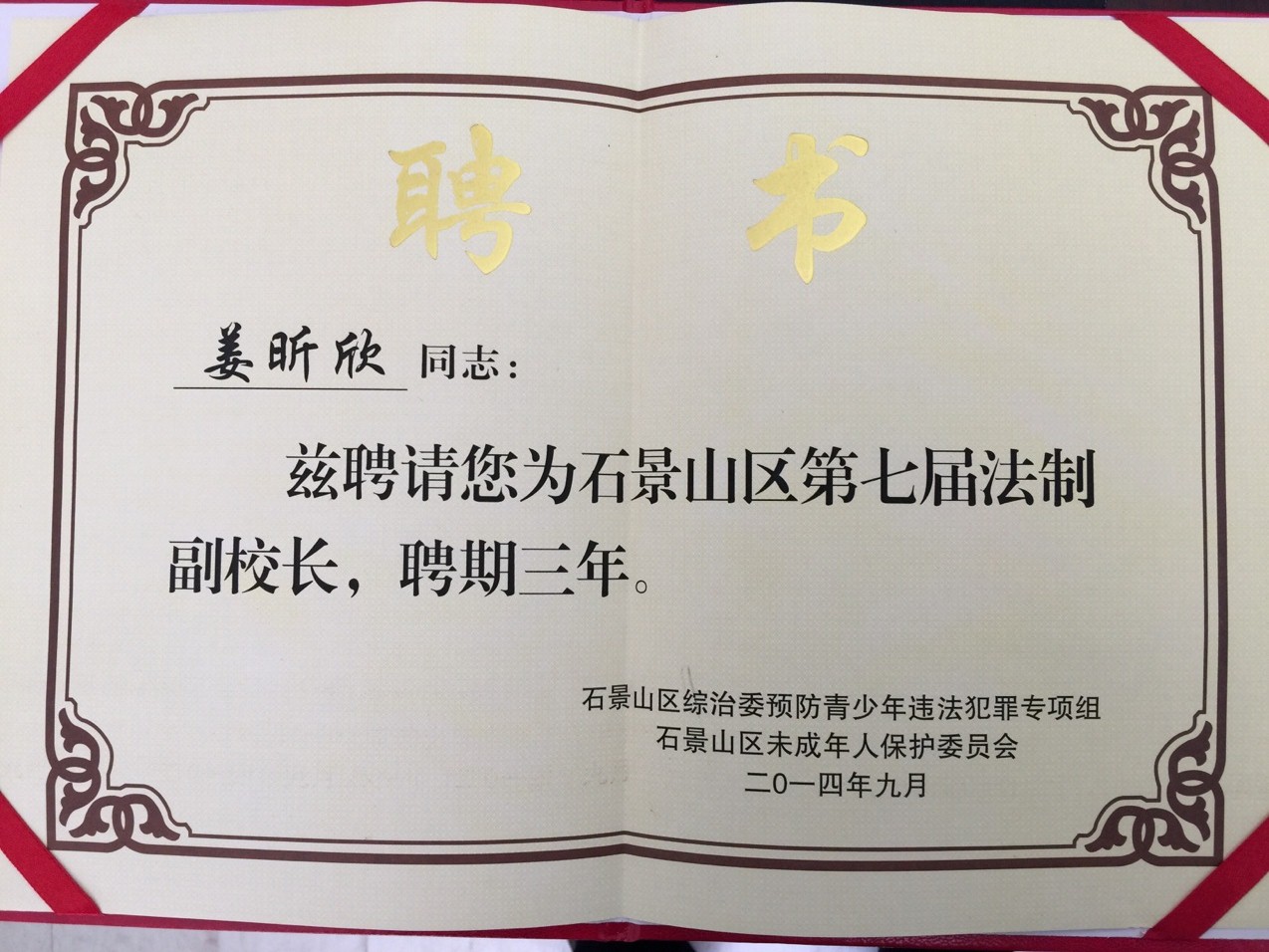 热烈庆祝我所姜昕欣律师被聘请为北京市石景山区炮厂小学法制副校长一职。