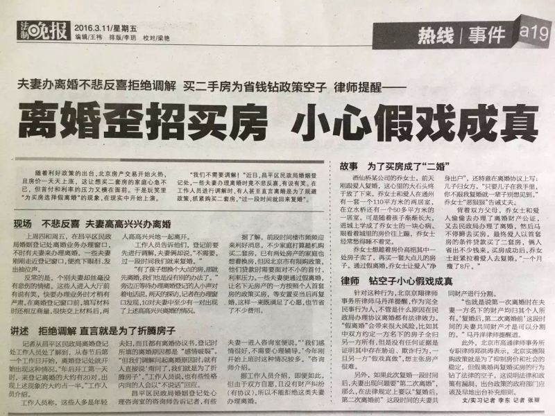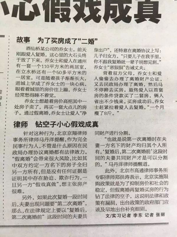 法制晚报讯(记者 李东 记者 张丽)随着利好政策的出台,北京房产交易开始火热,且房价一天天上涨,这让想买二套房的家庭心急不已,但首付和利率的压力又横在面前。于是玩笑里“为买房选择假离婚”的现象,在现实中开始上演。